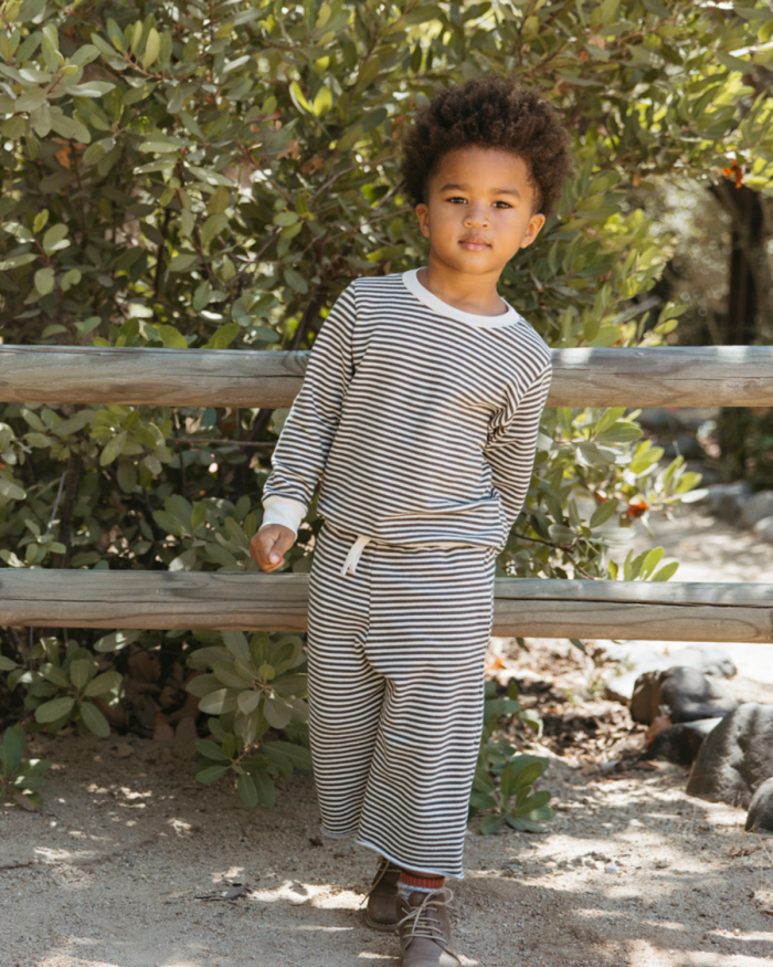 A French Terry Culotte, yes please! We really love the idea of neutral pieces for girls & boys to wear. Super comfy in our organic french terry with side seam pockets on both sides and raw edge hem. Elastic at waist and tacked natural twill at center.