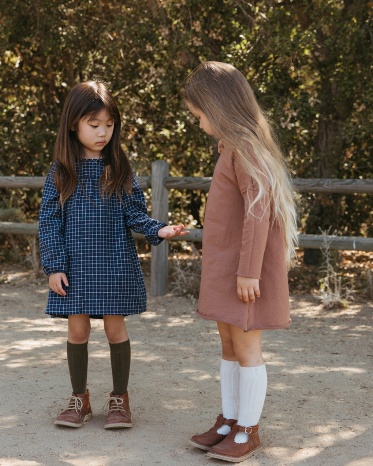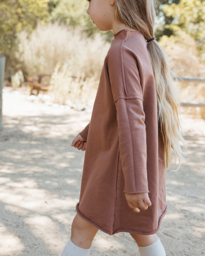 Our pullover style dress & tees are brand favorites both for Kids & Women!Ā  This dress has simple styling with raw edge neck, arms & hem and a dropped shoulder.Ā  Cozy & comfortable!