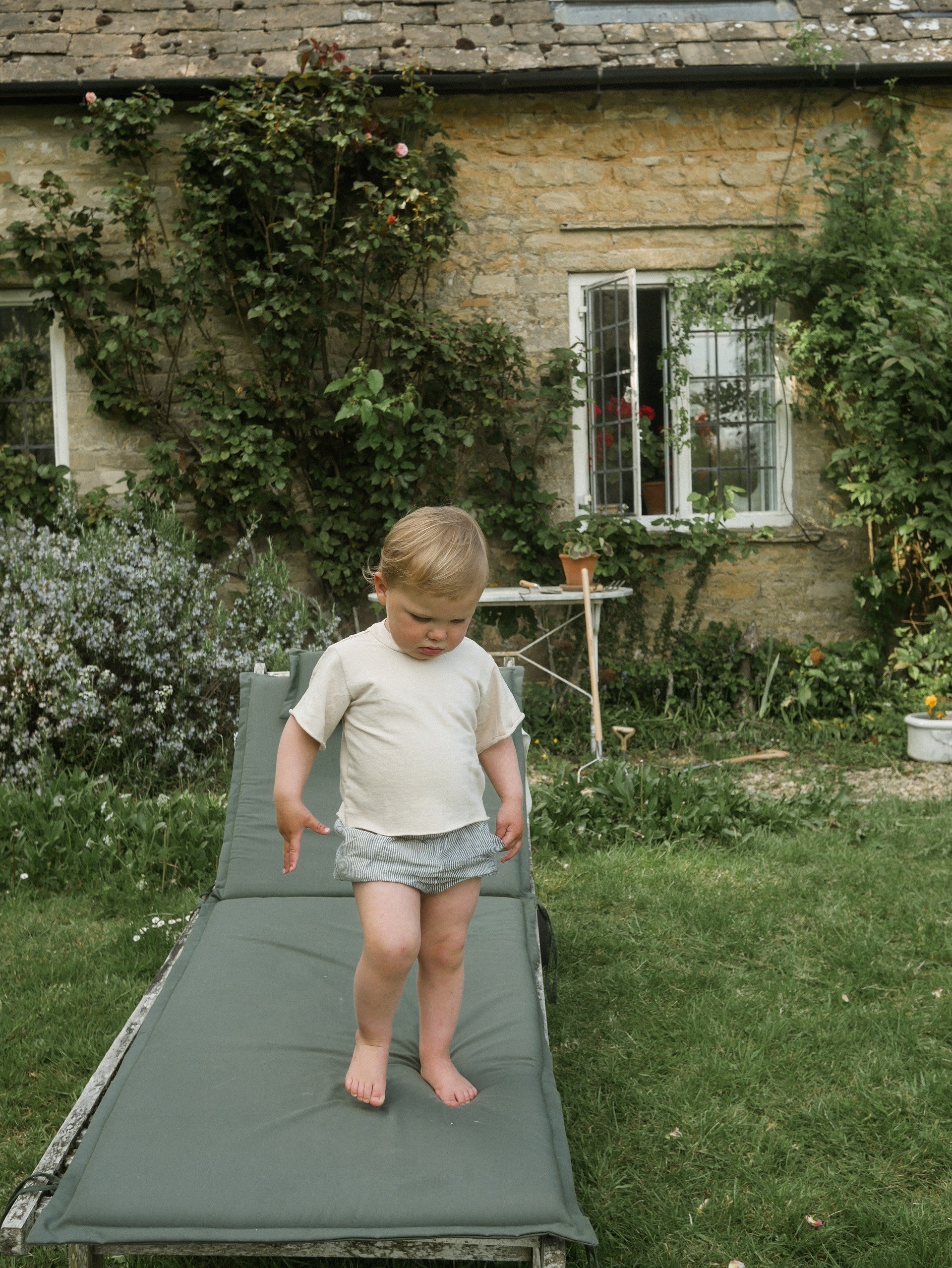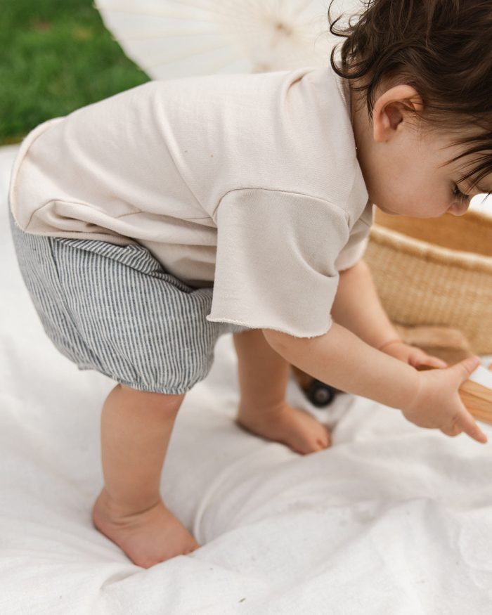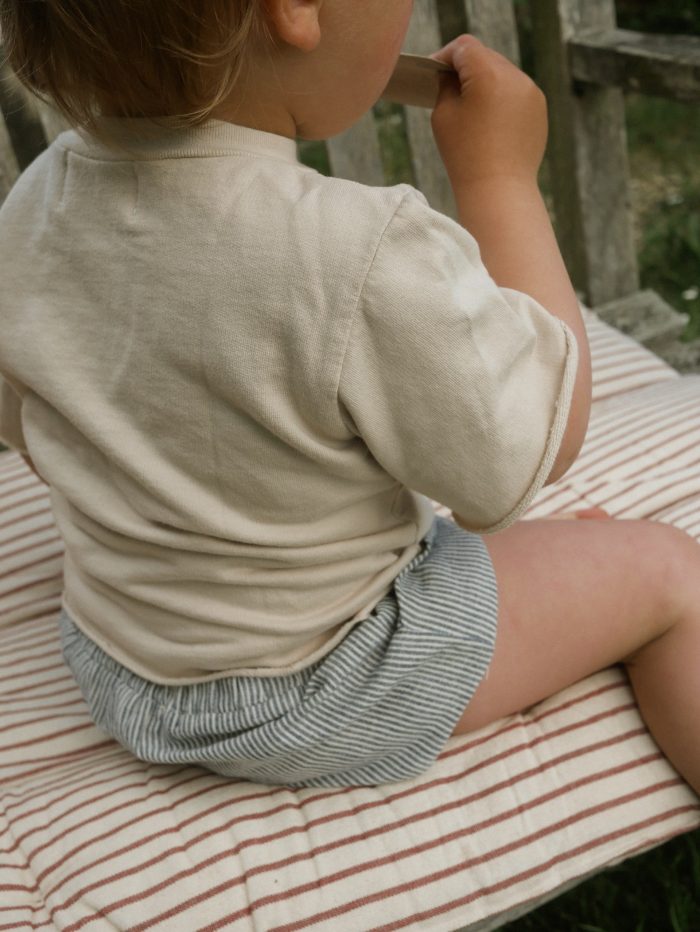 A t-shirt in French Terry, yes! Channeling the 70s on this one š We love the simplicity of the raw edge sleeves and hem. And yes darling on him or her!