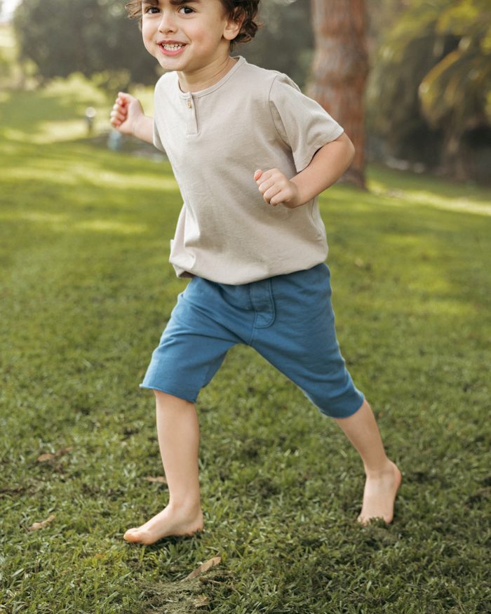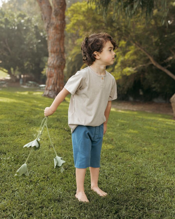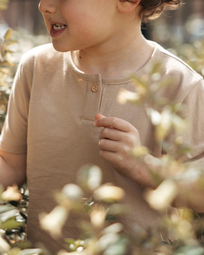 Always popular, our Jersey Henley has a small placket at center with a wooden button and jersey binding at neck.