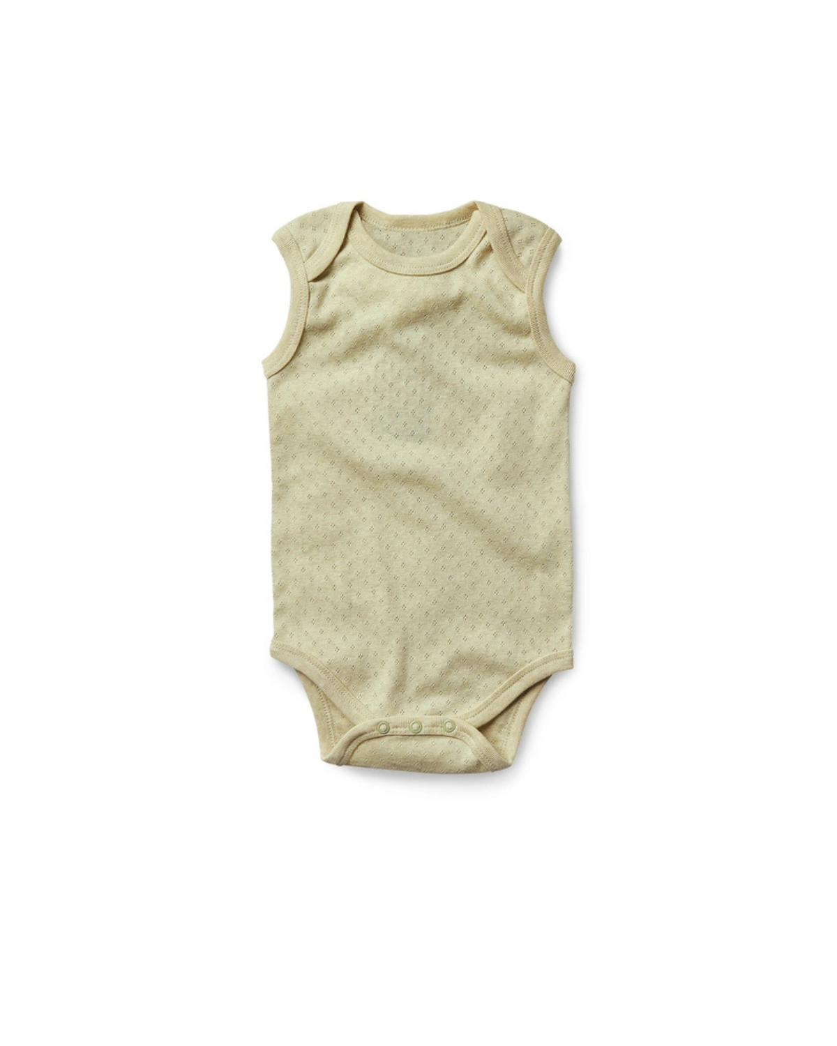 A Pointelle Sleeveless Onesie made with chemical-free Organic Natural Colour Cotton that is knitted into a classic Heritage pointelle for superior breathability and softness. Featuring an enveloped neck line, neck & sleeve binding, and dome snaps for convenient nappy changing, this body suit is 100% hypoallergenic for sensitive skin.