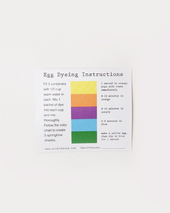 Kit includes: Three powder-based coloring packets made with all natural and organic vegetable and plant extracts with dried vinegar; eco-crayon for decorating eggs prior to dipping, grass seed, two eco-coconut husk pucks (just add water to make soil). Plus color chart and instructions.Ā
