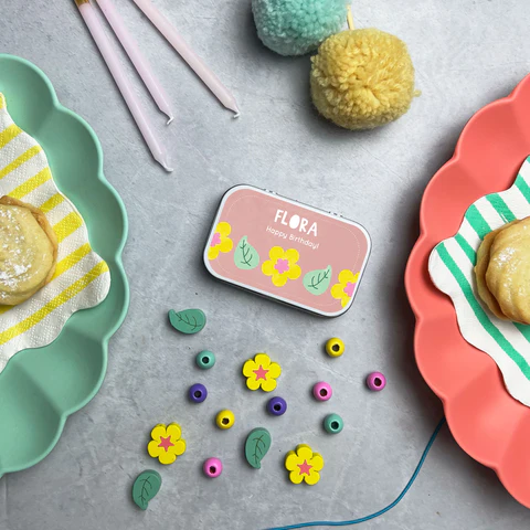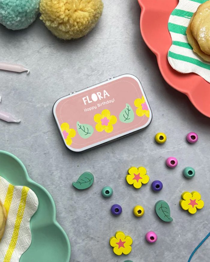 A beautiful little gift tin containing elastic & beads to create this flowery fairy bracelet. The elastic comes with hard ends to aid the beading process for young children. Then, patience & precision are all that’s required to assemble this piece.