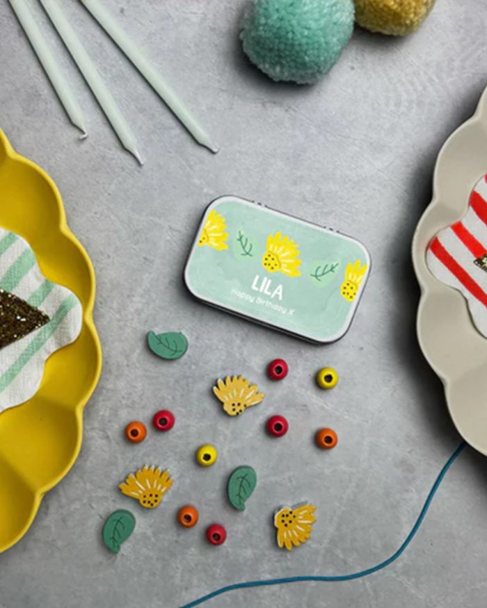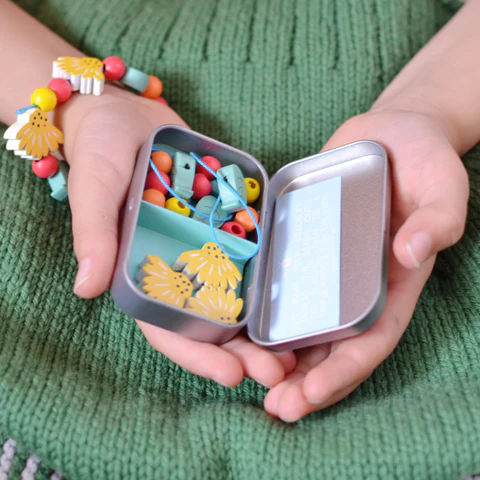 A beautiful gift tin containing elastic & beads to create this festival bracelet! The elastic comes with metal ends to aid the beading process for young children. Then, patience & precision are all that’s required to assemble this piece.