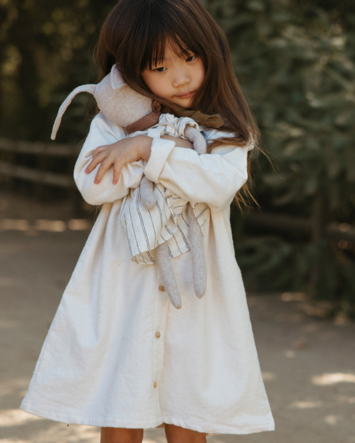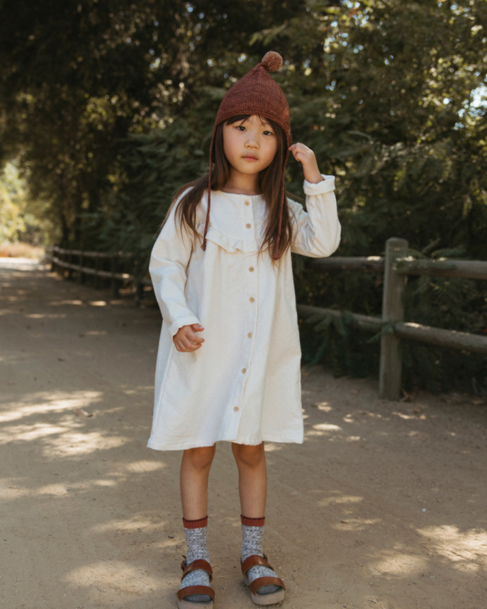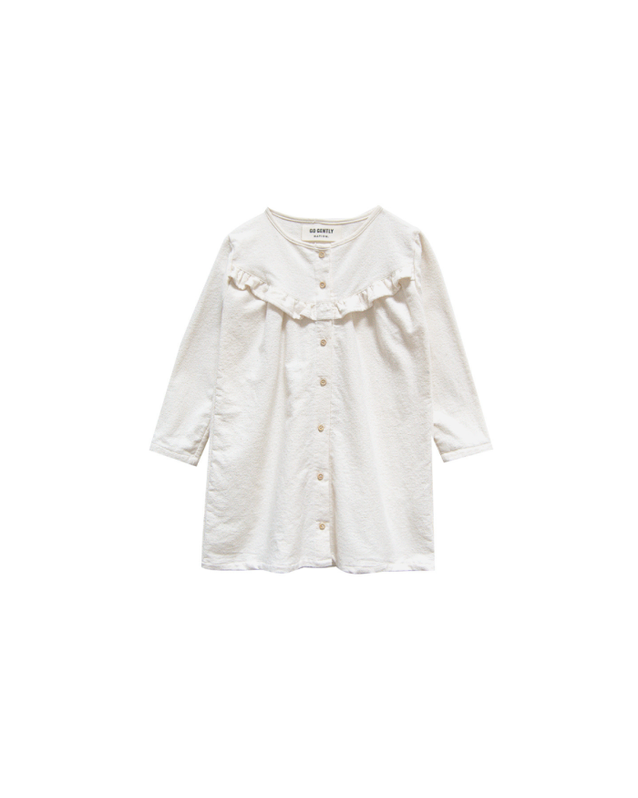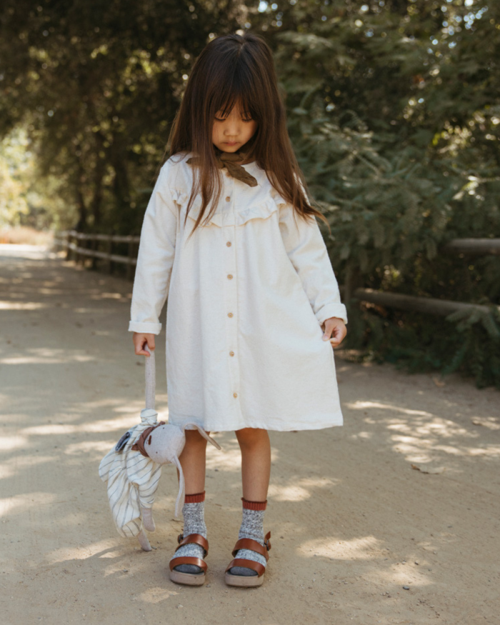 A soft organic flannel dress with wooden buttons down front & ruffle at front bodice. So simple and sweet! Made in our super soft organic natural flannel.Ā An easy everyday dress or special occasion dress she will be very comfortable in!