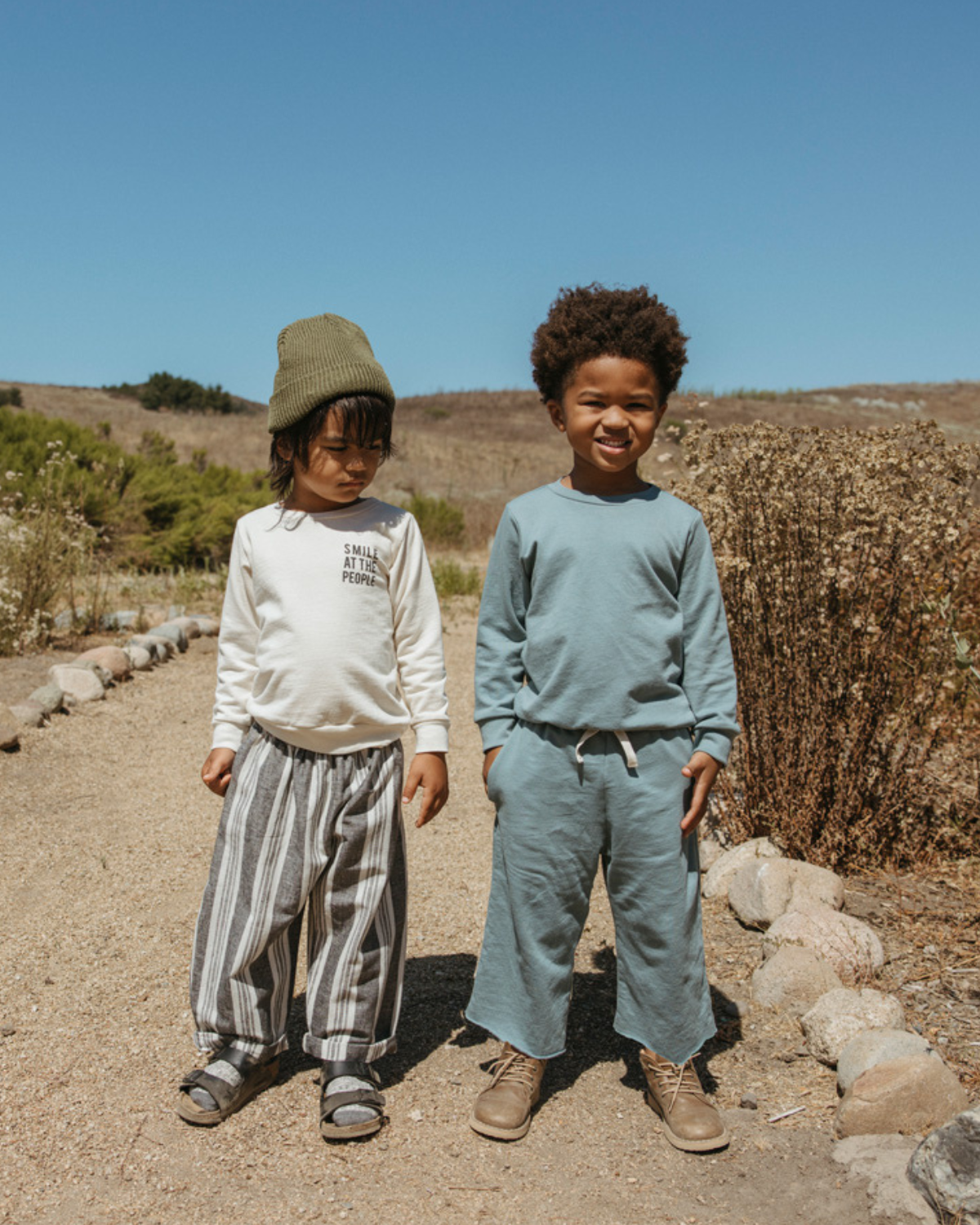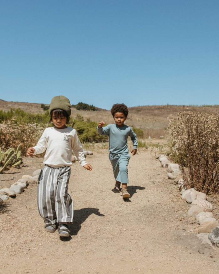 A French Terry Culotte, yes please! We really love the idea of neutral pieces for girls & boys to wear. Super comfy in our organic french terry with side seam pockets on both sides and raw edge hem. Elastic at waist and tacked natural twill at center.