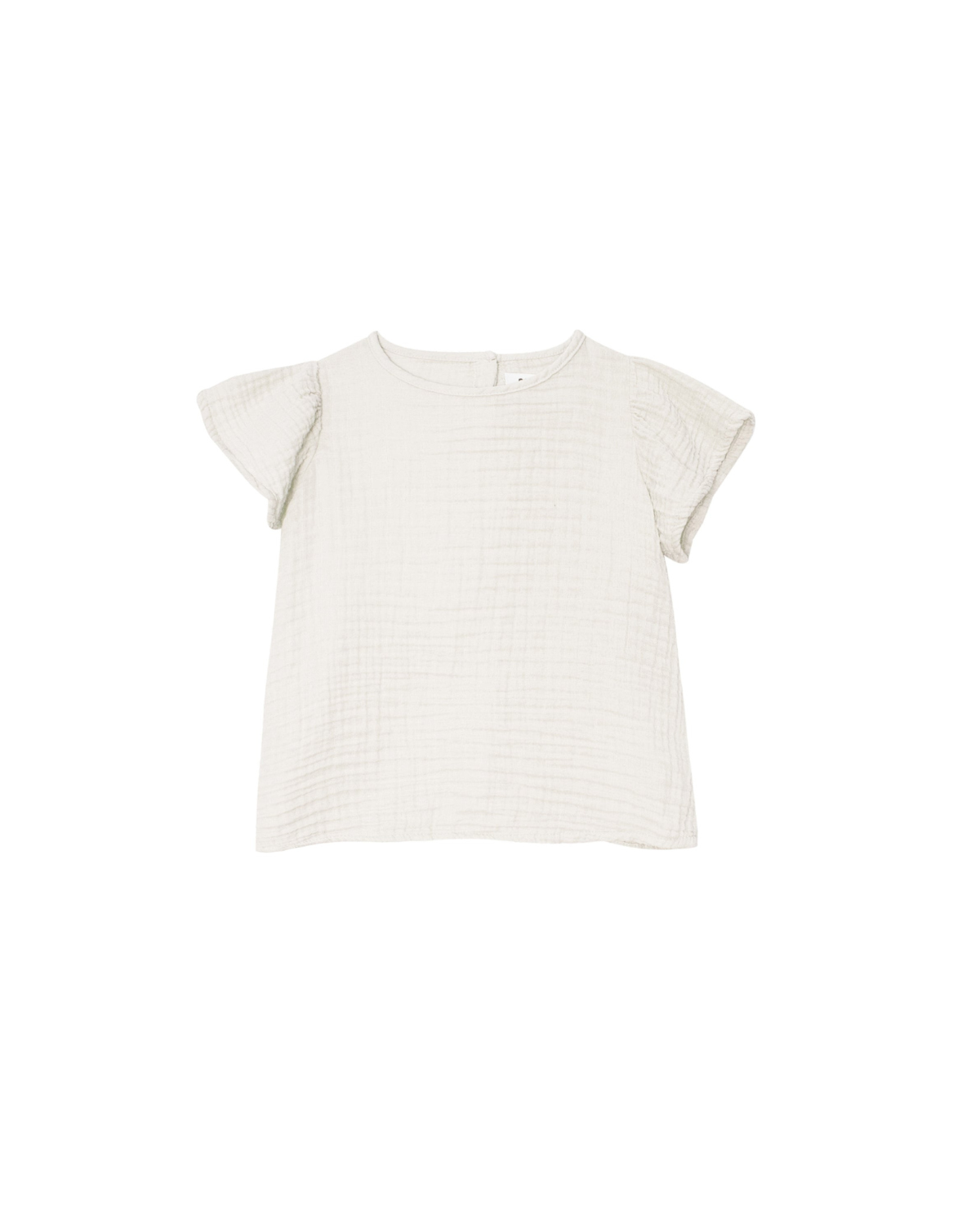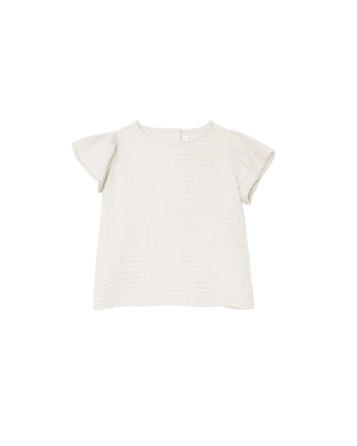 This sweet little blouse is crafted from soft, breathable organic cotton gauze, designed for warm days and gentle play. Featuring delicate flutter sleeves with shirring at the shoulders and a wooden button closure at the back, it’s both charming and consciously made.