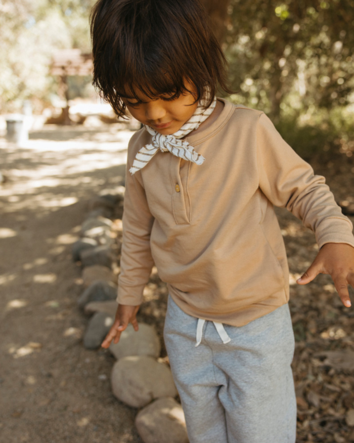 A comfy placket crewneck made from 100% organic French terry with 2 wooden button at center placket. Cuffs and waistband in French Terry.Ā