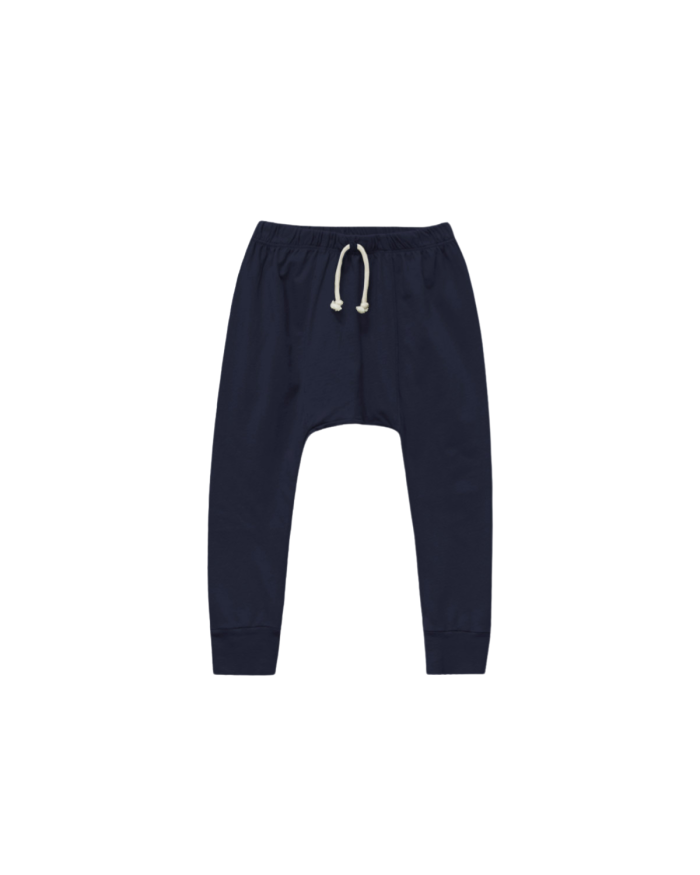 A unisex harem style pant with center front and back panel with rib cuffs and organic shoe lace tacked at center front. So easy and comfy!