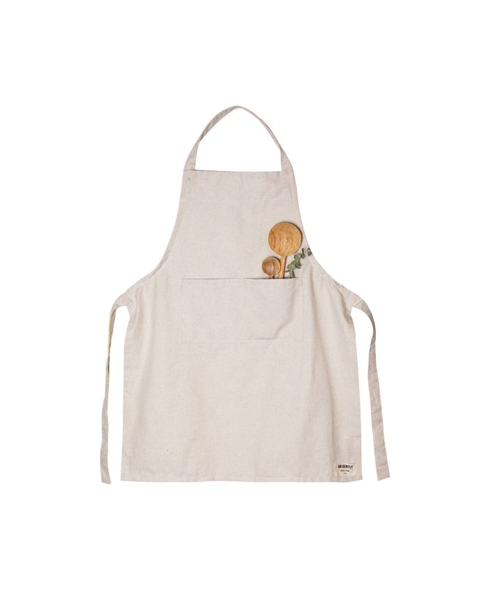 A Go Gently Nation apron for kids!Ā We had trouble finding one we liked to sell so we made one ourselves. The apron ties at the waist and has an adjustable strap at the neck with a corozzo nut button. Perfect for that little one who loves to join you in the kitchen!Ā Recommended for kids 3+ years and up.