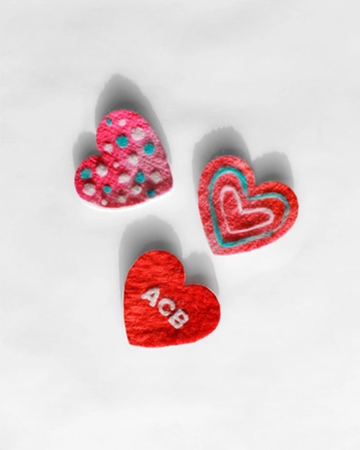Following simple instructions, crafters needle felt decorations and initials on pretty wool heart shapes. They will find enjoyment beyond honing the craft itself, as they can string the finished hearts and wooden beads together to make a cute wall hanging or use as individual ornaments.