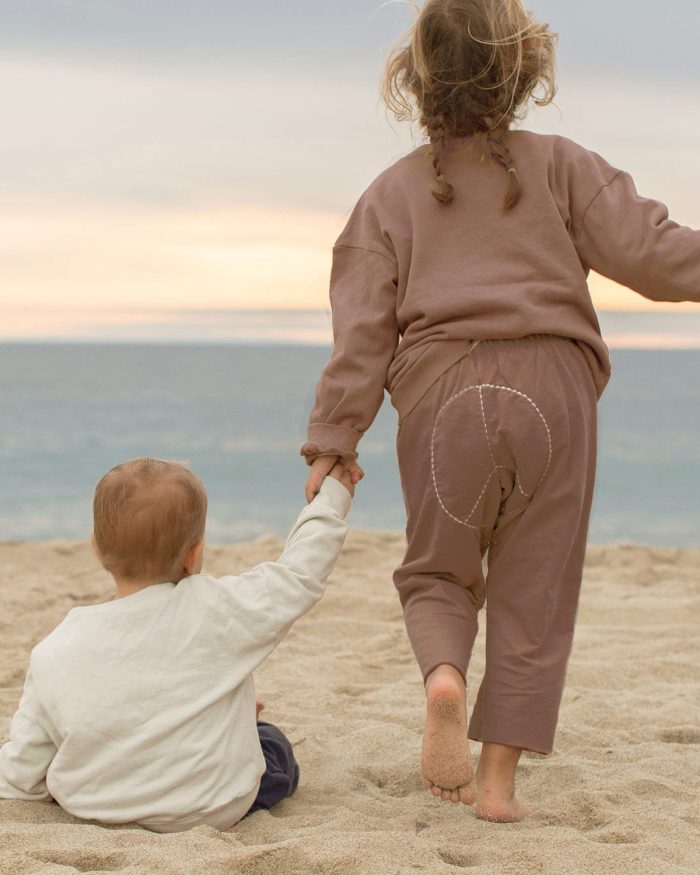 Made from 100% organic cotton french terry, elastic waist with tacked cotton twill tape drawstring at center front, a manually applied embroidered peace sign on the back with a raw edge hem.Ā  Generous fit and will be able to be worn for many months, long past the labels size šŸ™‚