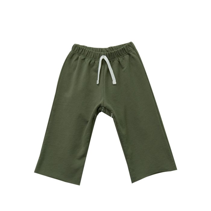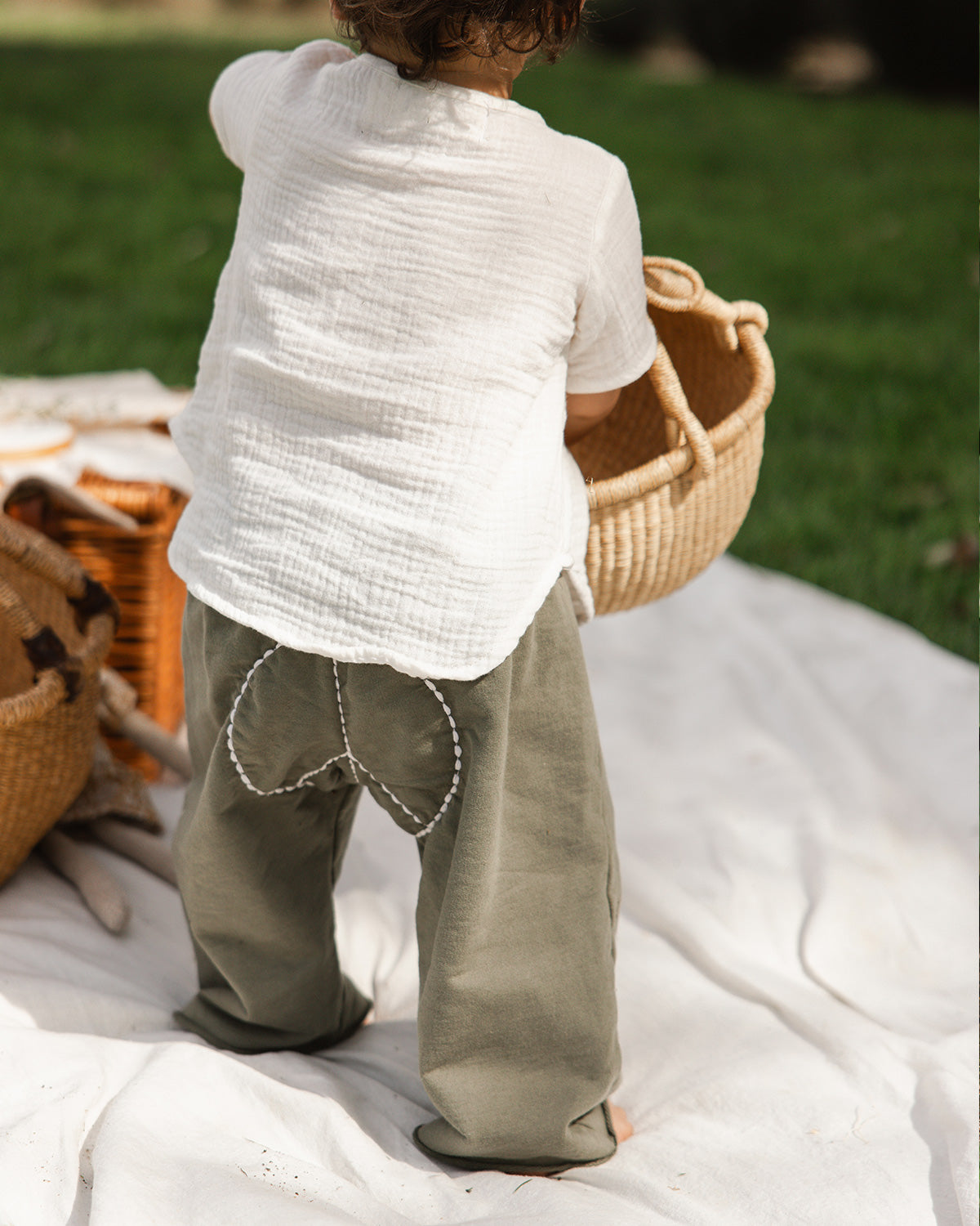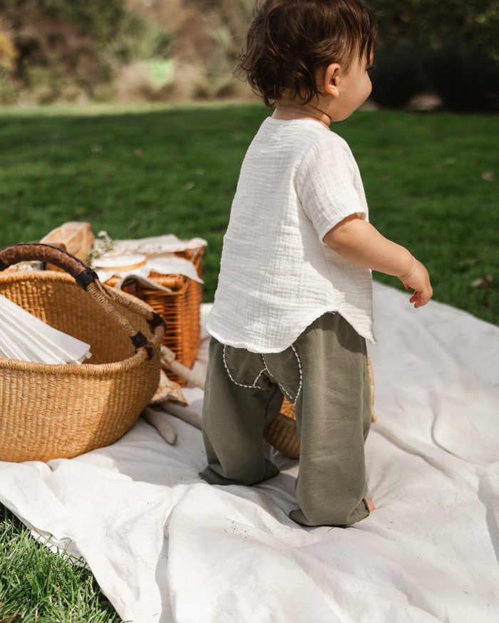 Made from 100% organic cotton french terry, elastic waist with tacked cotton twill tape drawstring at center front, a manually applied embroidered peace sign on the back with a raw edge hem.Ā  Generous fit and will be able to be worn for many months, long past the labels size šŸ™‚