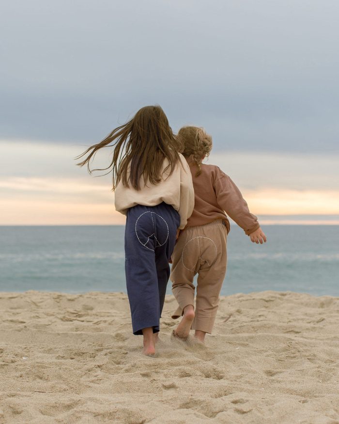 Made from 100% organic cotton fleece, elastic waist with tacked cotton twill tape drawstring at center front, a manually applied embroidered peace sign on the back with a raw edge hem.Ā Generous fit and will be able to be worn for many months, long past the labels size š