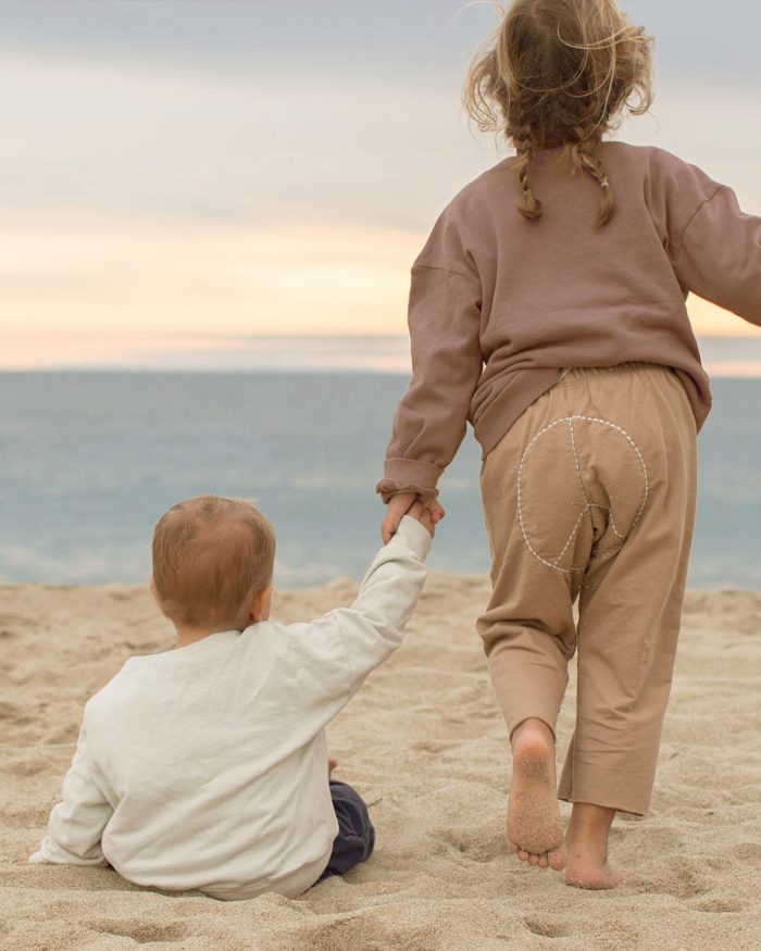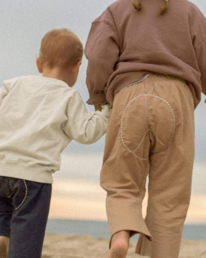 Made from 100% organic cotton french terry, elastic waist with tacked cotton twill tape drawstring at center front, a manually applied embroidered peace sign on the back with a raw edge hem.Ā  Generous fit and will be able to be worn for many months, long past the labels size šŸ™‚
