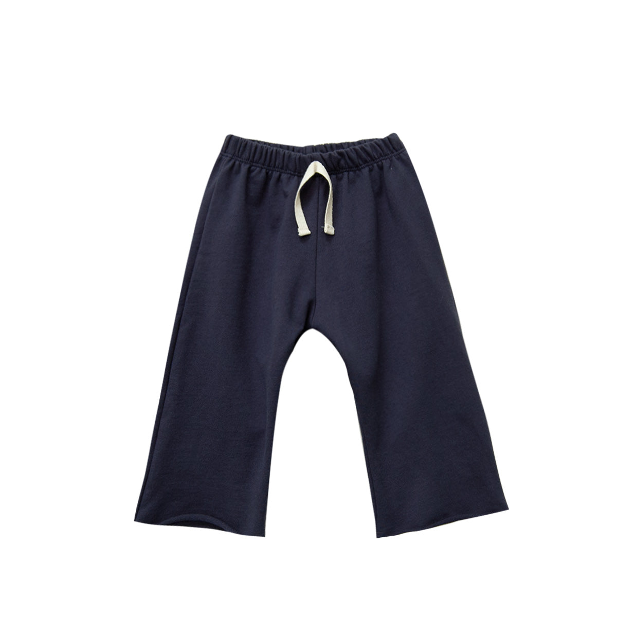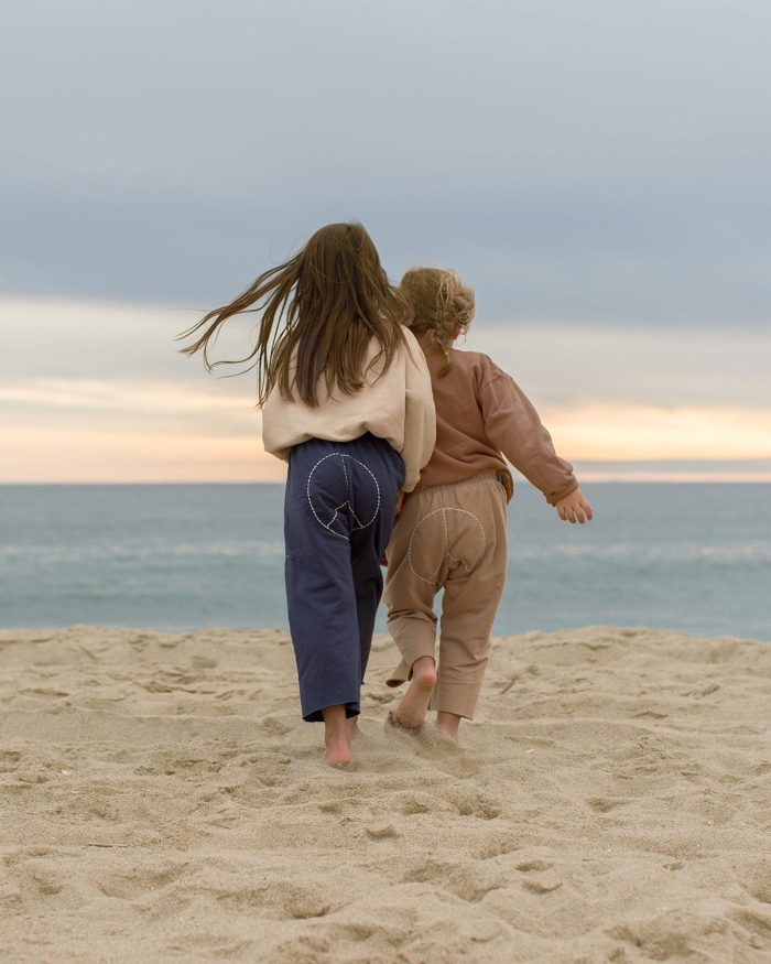 Made from 100% organic cotton french terry, elastic waist with tacked cotton twill tape drawstring at center front, a manually applied embroidered peace sign on the back with a raw edge hem. Generous fit and will be able to be worn for many months, long past the labels size šŸ™‚