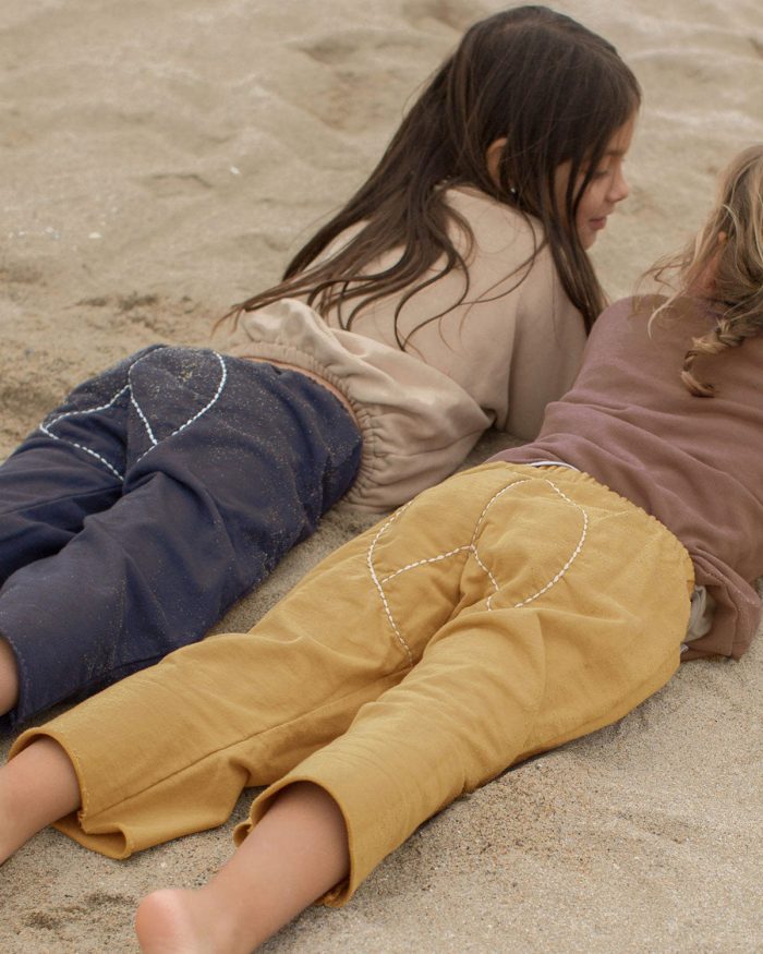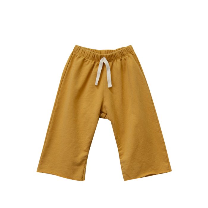 Made from 100% organic cotton french terry, elastic waist with tacked cotton twill tape drawstring at center front, a manually applied embroidered peace sign on the back with a raw edge hem.Ā Generous fit and will be able to be worn for many months, long past the labels size š