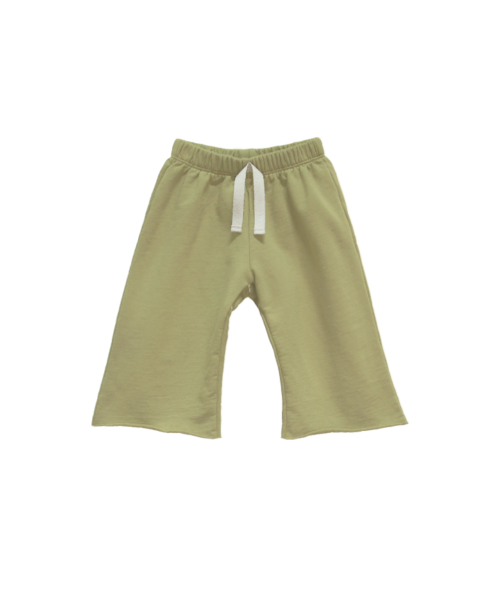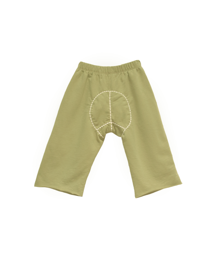 Made from 100% organic cotton french terry, elastic waist with tacked cotton twill tape drawstring at center front, a manually applied embroidered peace sign on the back with a raw edge hem. Generous fit and will be able to be worn for many months, long past the labels size š