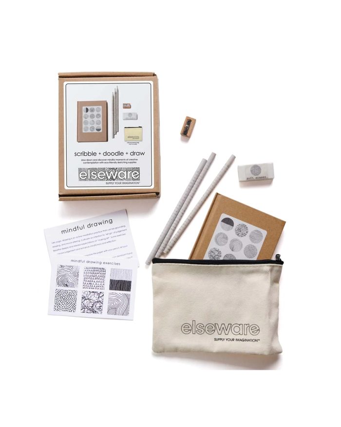 Scribble, doodle, and draw! Slow down and discover mindful moments of creative contemplation with eco-friendly sketching supplies.Ā This kit contains one hardcover blank book, three recycled paper pencils, one VOC-free eraser, one bamboo sharpener, and a handy canvas travel bag.Ā Ages 10 and up.Ā