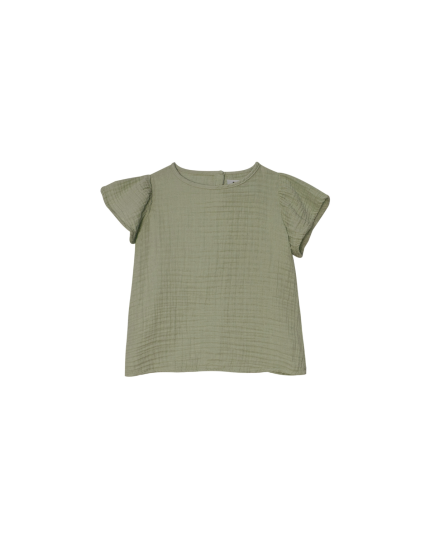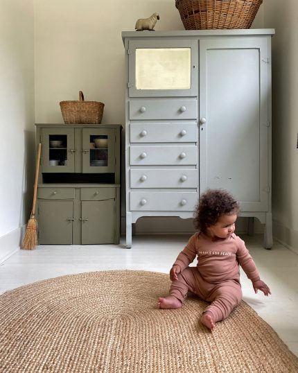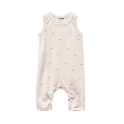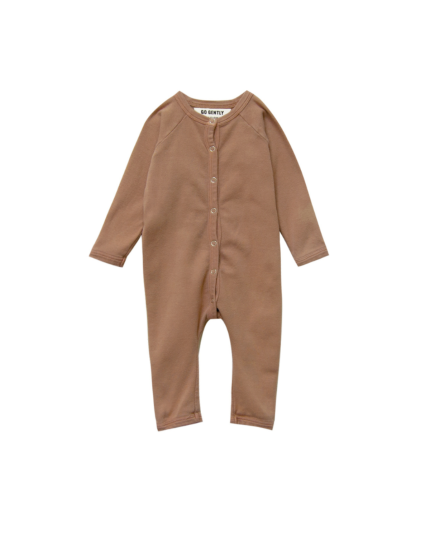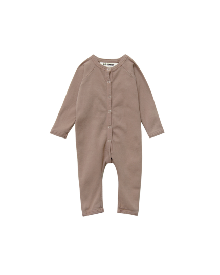 A soft rib romper with rib binding down center of romper and along neckline with ring snaps.
