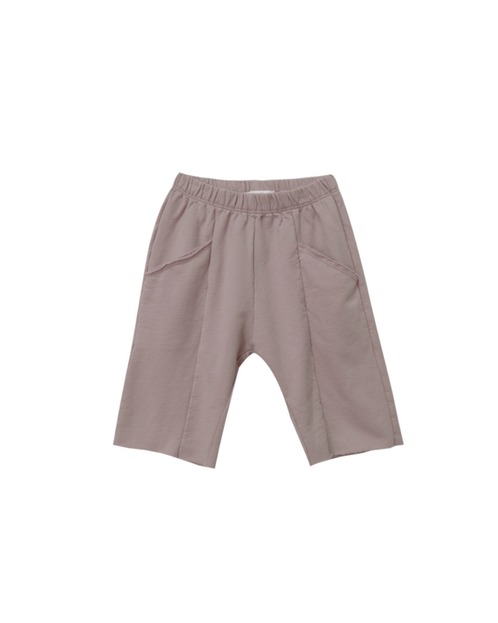 Organic french terry pocket boys’ shorts with angled raw edge paneled pockets on front with raw edge hem and elastic at waist. Very comfy!