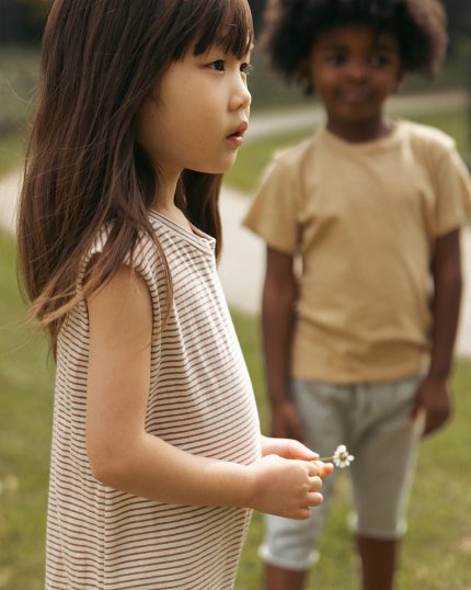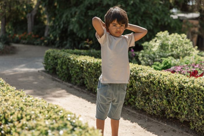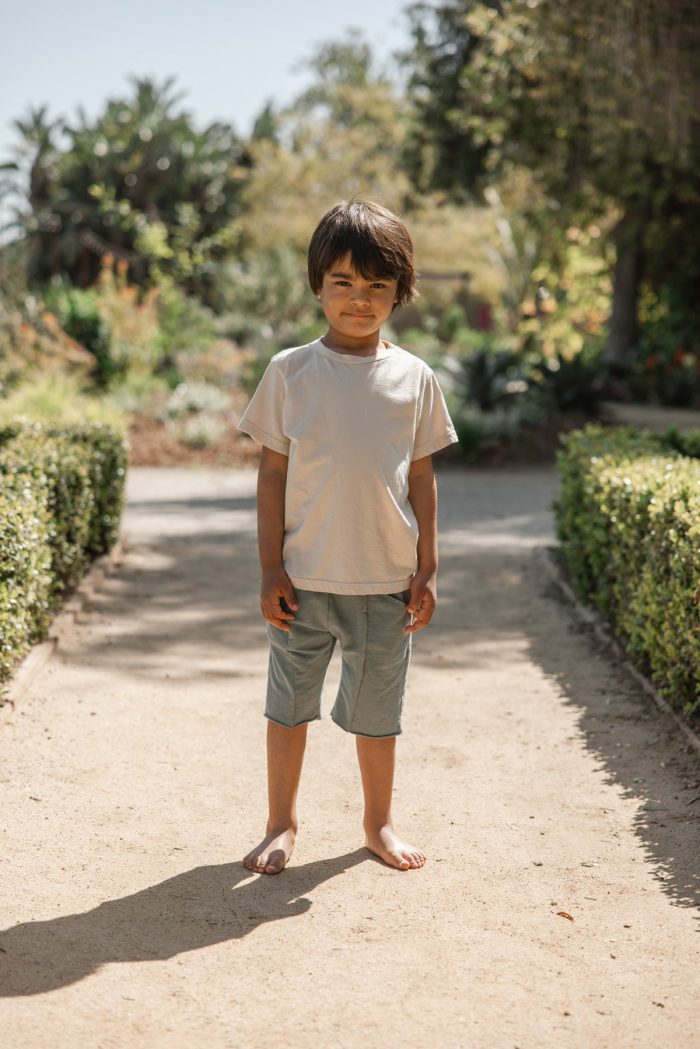 Organic french terry pocket boys’ shorts with angled raw edge paneled pockets on front with raw edge hem and elastic at waist. Very comfy!