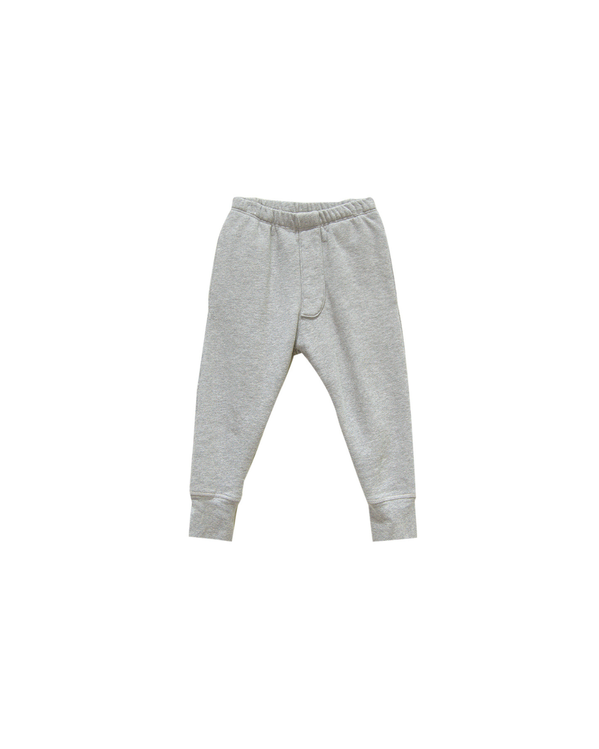 Our most popular boys pant! For the stylish little guy, this is a modern slim style pant with rib cuffs & faux fly. The heather gray is in a soft fleece season. Elastic waistband.