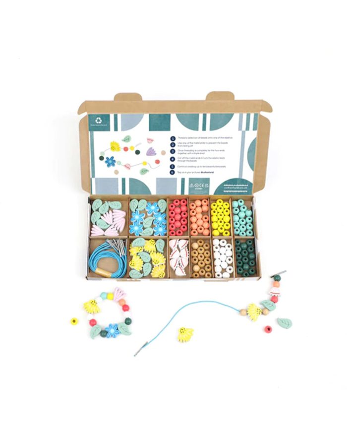 The Wildflower bracelet making kit is perfect forĀ 3yrs+. Containing enough wooden beads to make 10 bracelets, a selection of wildflower beads await. A selection of brightly colored spacer beads complement the showpiece beads for the ultimate in flowery accessories. Children can wear the bracelets with their favorite outfits, gift them to friends they love, or make them with friends at a party.