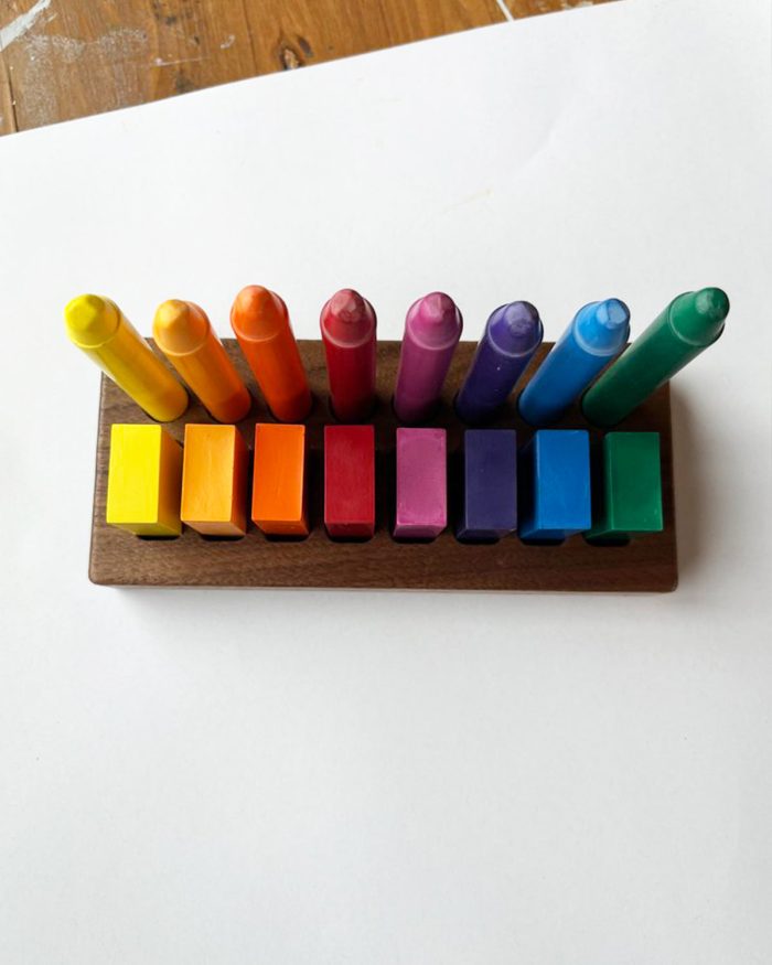 A lovely way to display & inspire creativity for kids! Fits eight stick crayons and eight block crayons. Beautifully handcrafted out of Walnut.Ā